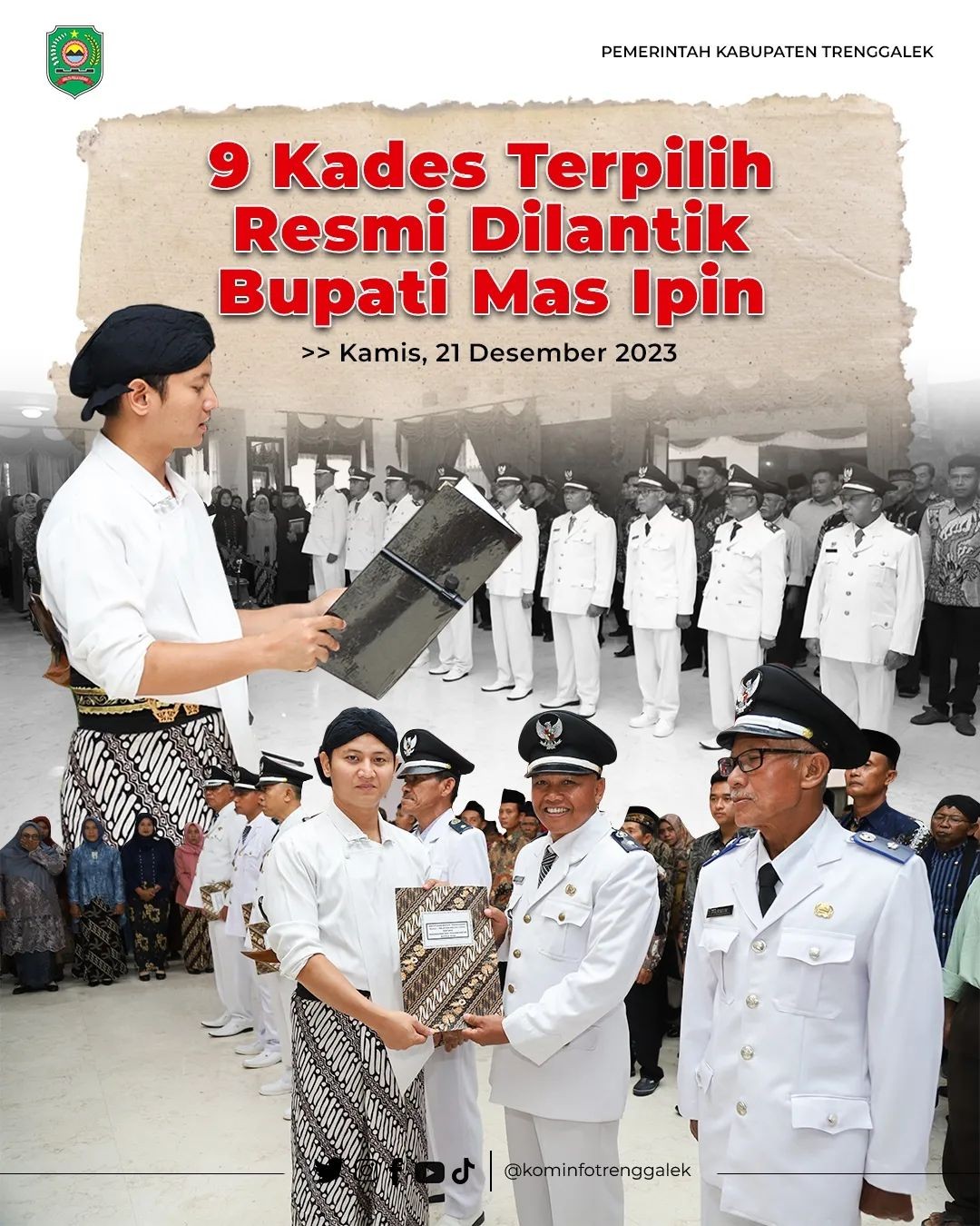 Trenggalek, Mochamad Nur Arifin, melantik 9 Kepala Desa terpilih hasil Pilkades serentak 5 Oktober 2023. Pelantikan berlangsung di Pendopo Manggala Praja Nugraha pada Kamis (21/12/2023).