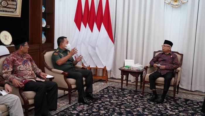 Wakil Presiden (Wapres) Ma’ruf Amin menerima audiensi Kepala Staf Angkatan Darat (KSAD) Jenderal TNI Dudung Abdurachman dan Ketua Majelis Ulama Indonesia (MUI) Bidang Dakwah dan Ukhuwah Cholil Nafis di kediamannya.